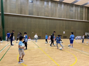 横浜FCの普及部およびスクールコーチと参加者でアイスブレイク、親子でボール遊び、シュート、ミニゲームなど