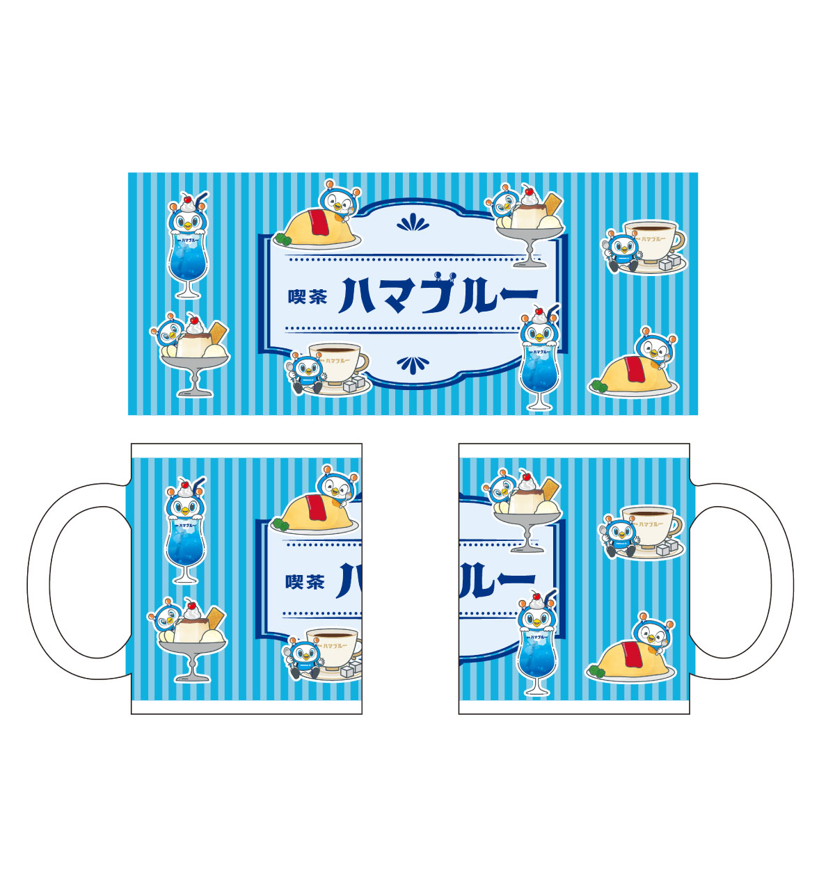 喫茶ハマブルーをテーマにコーヒーやクリームソーダ、オムライス、プリンなどの喫茶店メニューとフリ丸が融合したレトロで可愛らしいデザインのマグカップになっています。ご自宅や職場で喫茶店気分を味わってください!