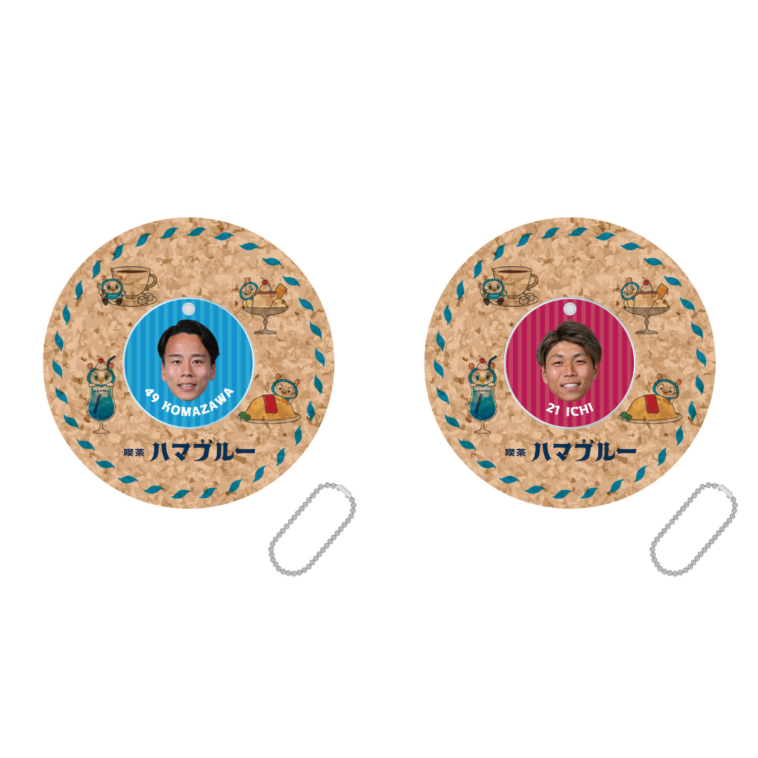 喫茶ハマブルーをテーマにアクリルキーホルダーにもなるコルクコースターが新登場!コルクコースターはコーヒーやクリームソーダ、オムライス、プリンなどの喫茶店メニューとフリ丸が融合したレトロで可愛らしいデザインになっています。真ん中の選手のお顔がデザインされたアクリルはキーホルダーとしてお使いいただけます!