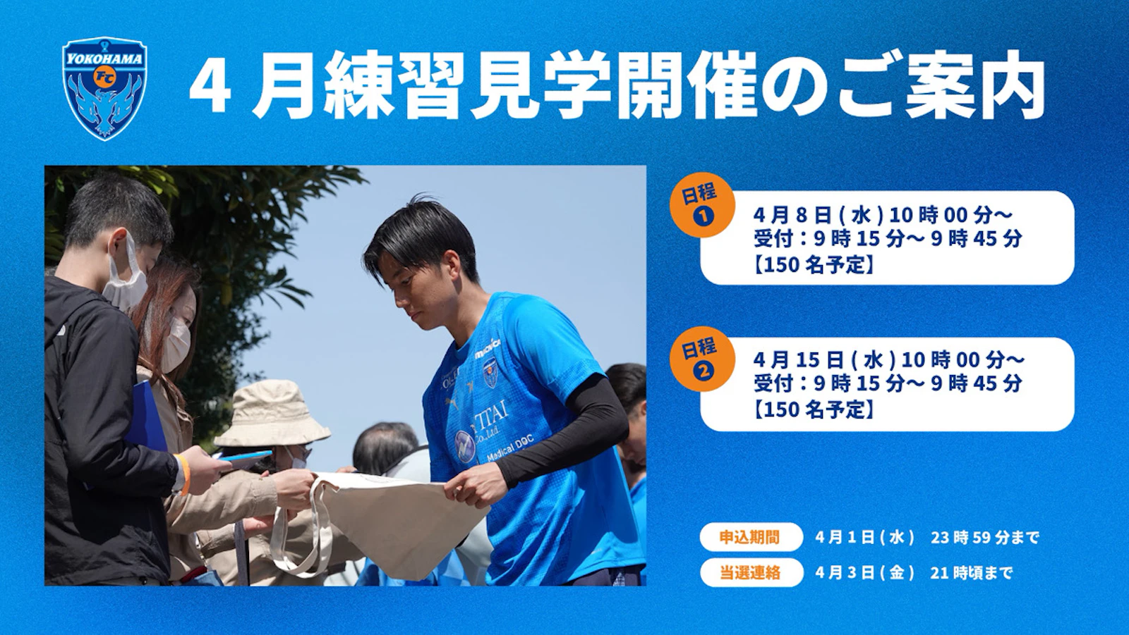 ②「マイページ>MENU>お知らせ」の『【横浜FC】2026年4月 トップチーム練習見学開催のお知らせ』に記載されているURLよりお申し込みいただけます。