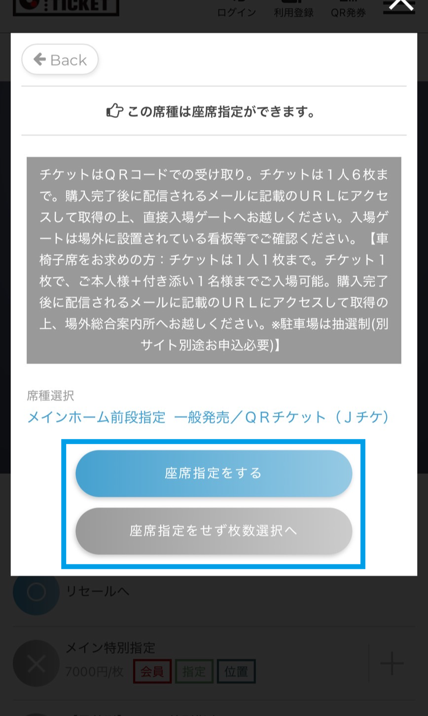 「座席指定をする」「座席を指定せず枚数選択へ」から枚数を選択し「座席を確定する」を押す